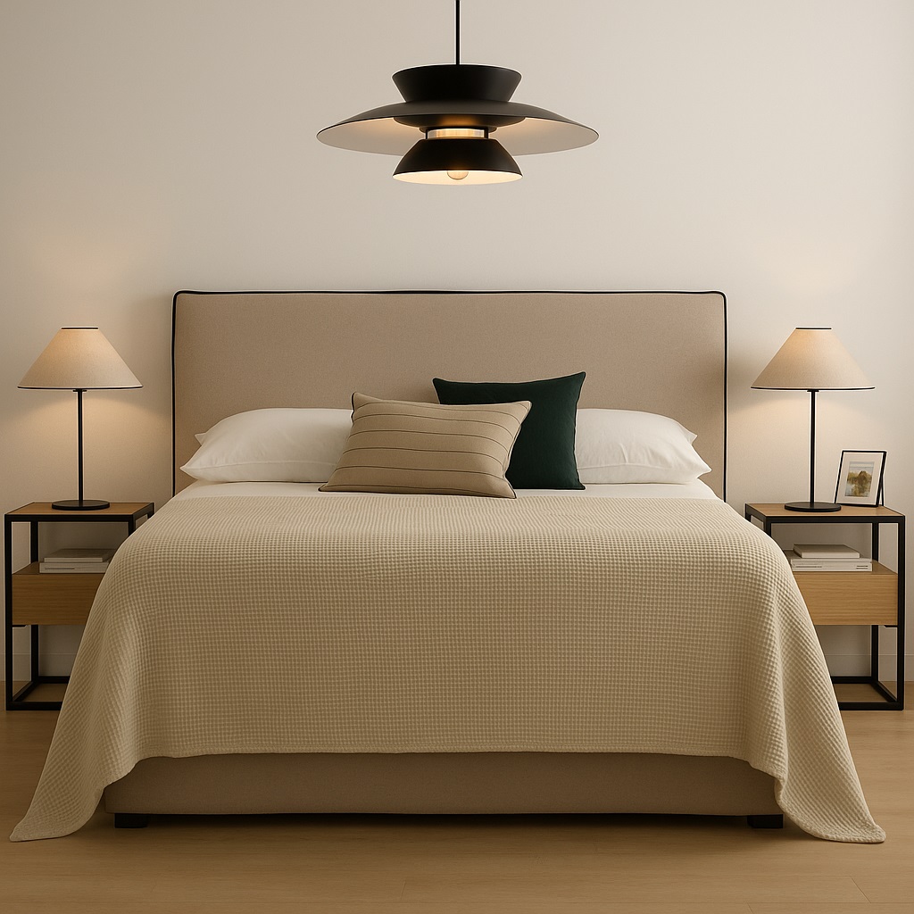 1 x king size bed with mattress 2 x nightstands 2 x bedside lamps 1 bench 1 x pendant light